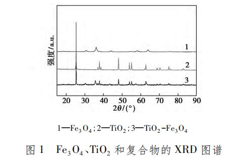 Fe3O4、TiO2 和復(fù)合物的 X 射線衍射圖譜如圖 1所示。