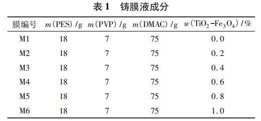 采用浸沒沉淀相轉(zhuǎn)化法制備膜,以 TiO2 -Fe3O4 為改性劑進(jìn)行共混改性,設(shè)計(jì)實(shí)驗(yàn)配比,如表 1所示。