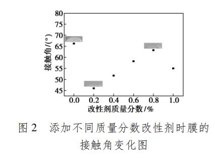 由圖 2 可以看出,當(dāng)不添加共混改性劑時(shí),接觸角最大,說明單純的 PES 膜是疏水性比較強(qiáng)的膜,因?yàn)?/span> PES 含有0.jpg基團(tuán),所以表現(xiàn)出疏水性。